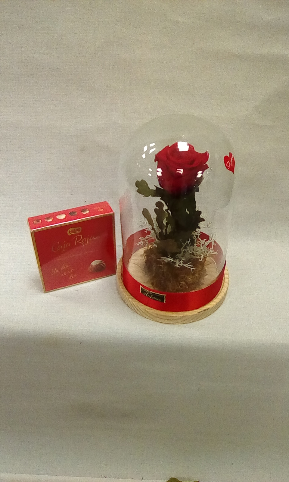 Ramo de 12 rosas rojas con jarron de cristal y bombones