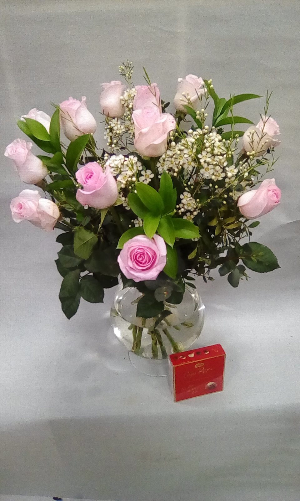/ Ramo de 12 rosas rosas con jarron y bombones.